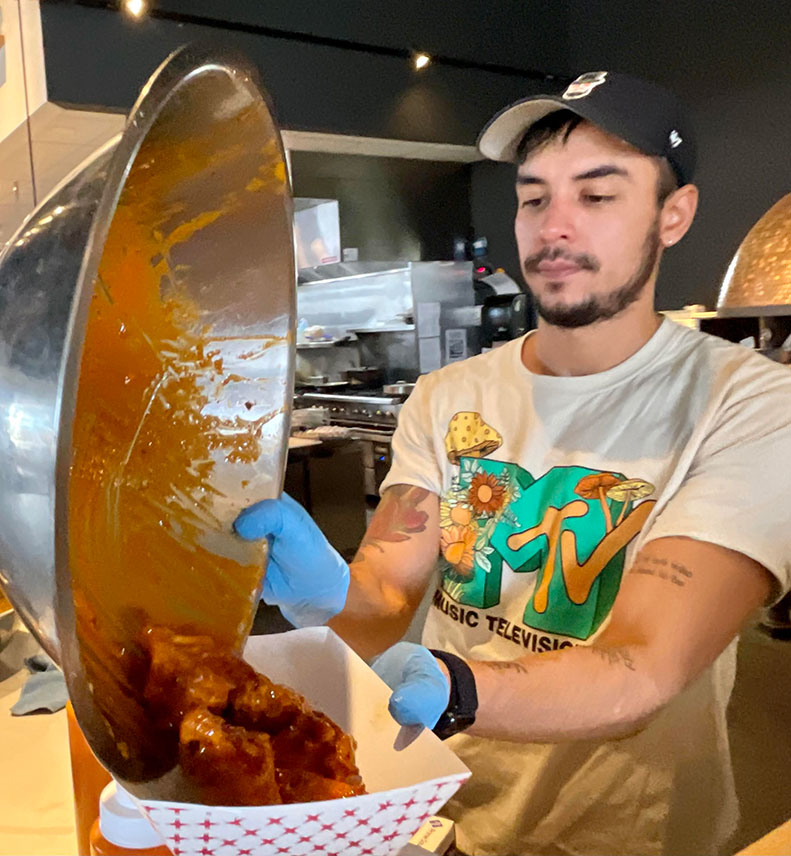 Description: Fresh, never frozen, large drums and flats with scratch-made, hand-applied breading. “It’s how (stuff) should be done,” Ramirez said. “A lot of people go frozen and right into the fryer and throw some cheap sauce on it. You have to take the time.” Popular flavors include O.G. Buffalo (original), Gold Digger (mustard/barbecue), So.Co. (sweet, tangy, spicy barbecue) and Le’Pepp (lemon pepper).