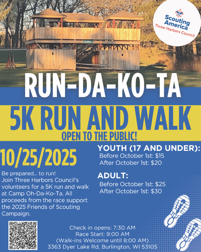 Be prepared… to run! Join Three Harbors Council’s volunteers for a 5K run and walk at Camp Oh-Da-Ko-Ta. All proceeds from the race support the 2025 Friends of Scouting Campaign.