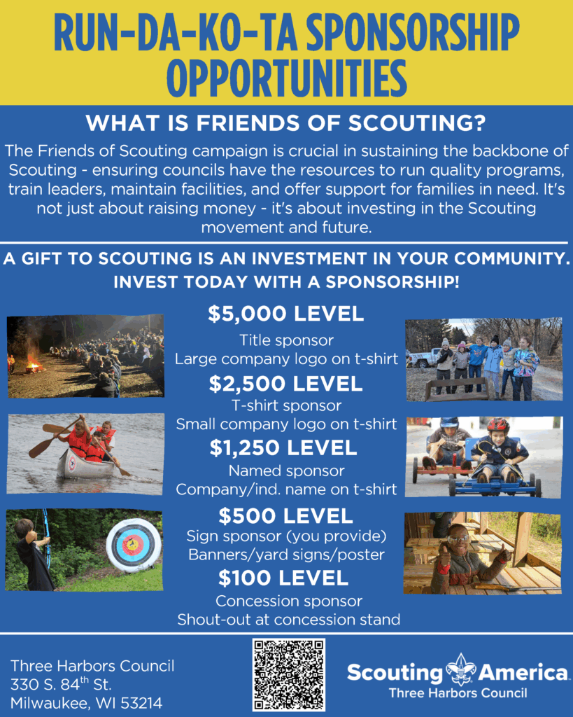 The Run-Da-Ko-Ta 5k (R5K) is a fundraiser for the 2025 Friends of Scouting Campaign. Scouting America is a 501 (c) (3) non-profit organization that relies on donors for funding. The generous donors who support are affectionately referred to as Friends of Scouting, or FOS. Each calendar year has its own FOS Campaign, but the goal of each campaign is always the same: to provide quality outdoor programming for youth in the greater Milwaukee area. Funds raised through FOS support camp and building maintenance, recruiting materials for our units, training resources for adult volunteers, and much more.